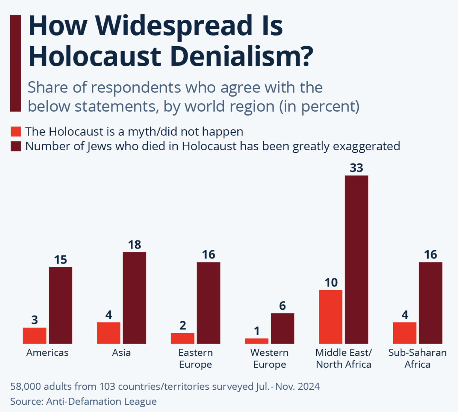 A new survey by the Anti-Defamation League shows that 4 percent globally deny today that the Holocaust happened. This number was 5 percent among men and 5 percent among people between the ages of 18 and 49. While in Asia and Sub-Saharan Africa, rates of Holocaust denialism were average, they were elevated in North Africa and the Middle East. They were at below-average rates in Western Europe (1 percent of respondents). However, many more respondents said they believed that the number of victims of the Holocaust had been greatly exaggerated. This reached as high as a third of respondents in North Africa and the Middle East, 18 percent in Asia, 16 percent each in Eastern Europe and Sub-Saharan Africa and even 15 percent in the Americas.