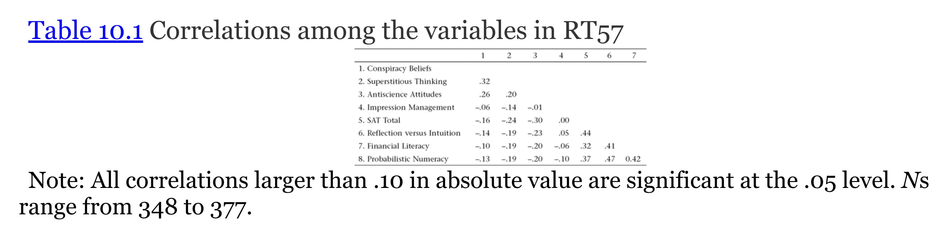 Table 10.1 presents the correlations between the raw score on the Conspiracy Beliefs subtest and the other variables in this study. As expected, the Conspiracy Beliefs subtest correlated (p < 0.001) with both the raw Superstitious Thinking subtest score (r = 0.32) and the raw Antiscience Attitudes subtest score (r = 0.26). Also as expected, the latter two subtests correlated with each other (r = 0.20, p < 0.001). Because these three subtests were self-report questionnaire measures, we were concerned about social desirability/impression management issues contributing to the variance. Therefore, in this and other studies, we have included a ten-item Impression Management scale (Cronbach’s alpha = 0.72) adapted from the work of Paulhus (1991). The next line in table 10.1 indicates that impression management was not highly associated with responses on these three subtests. Two of the three correlations were not significant even with this substantial sample size, and the third was –0.14 (p < 0.01.); in the latter case, higher impression management was associated with rejection of superstitious thinking.