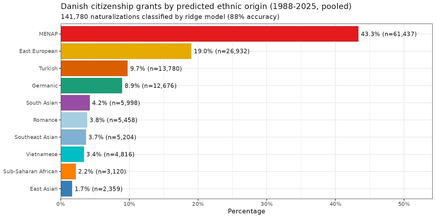 Autistic model details aside, this is the final best guess distribution of the people naturalizing in Denmark: