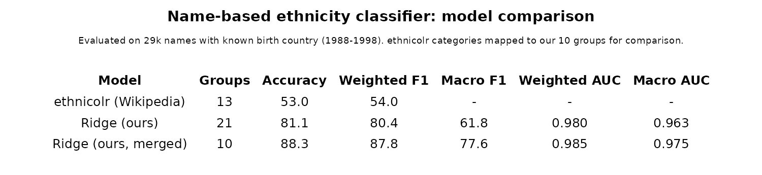 Using the names of people, we can attempt to infer their ethnicity for the years we have no birth country data. There are a variety of such name-to-ethnicity prediction models available. A commonly used one is ethnicolr. It produces these results: