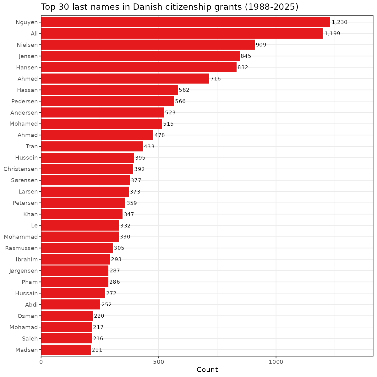There are a lot of Danish ones, which presumably reflect foreign spouses taking a Danish name and eventually acquiring citizenship. The most common is the Vietnamese Nguyen.