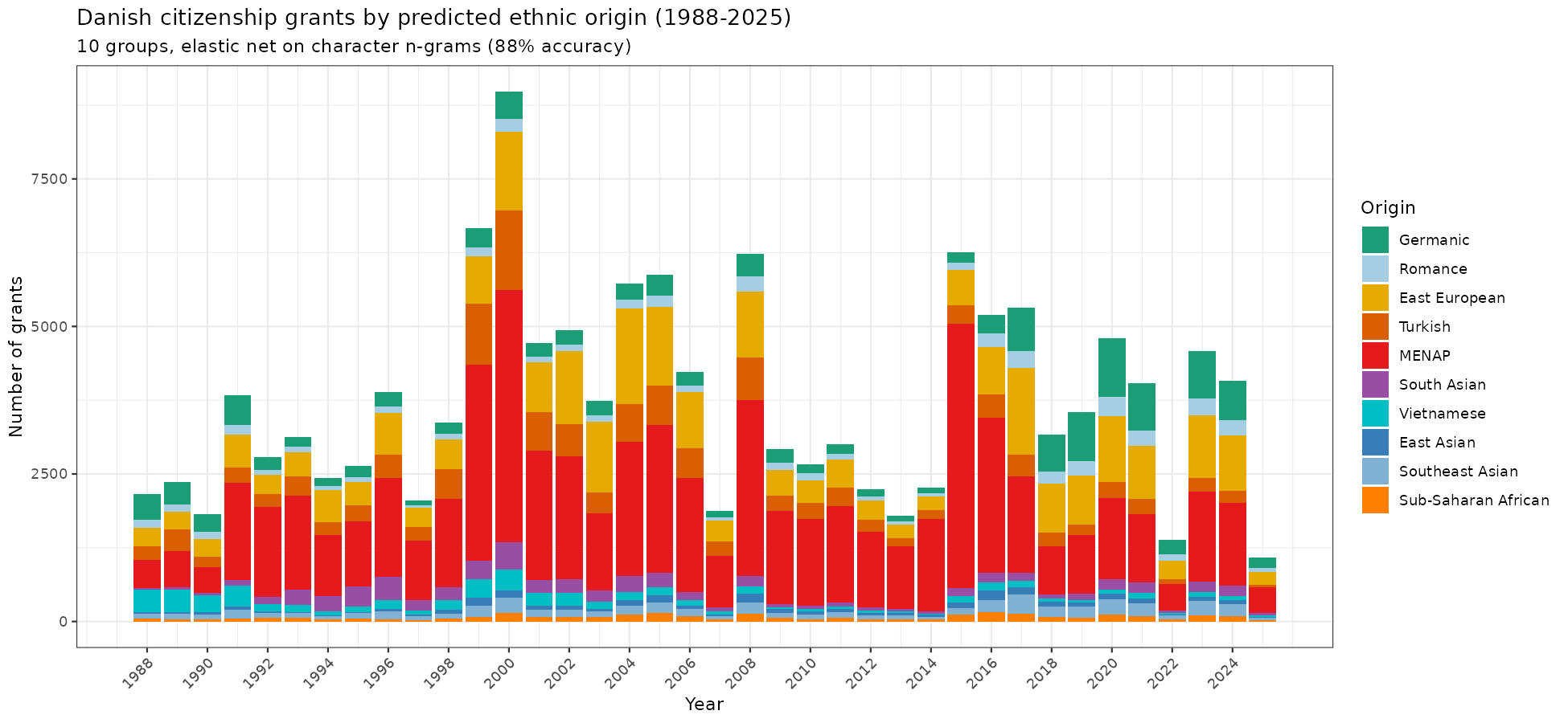 Of particular concern is that this prediction model has no Turkish group, but Turks are the largest foreigner group in Denmark. Of course, for people with mixed origin names, we cannot determine for sure what ethnicity they belong to, but we can at least make a reasonable guess. So I decided to build my own prediction model using the pre-2000 names and origin countries. This gives us this result:
