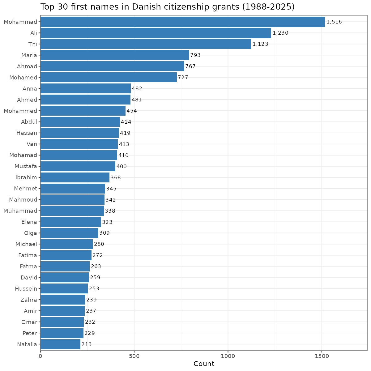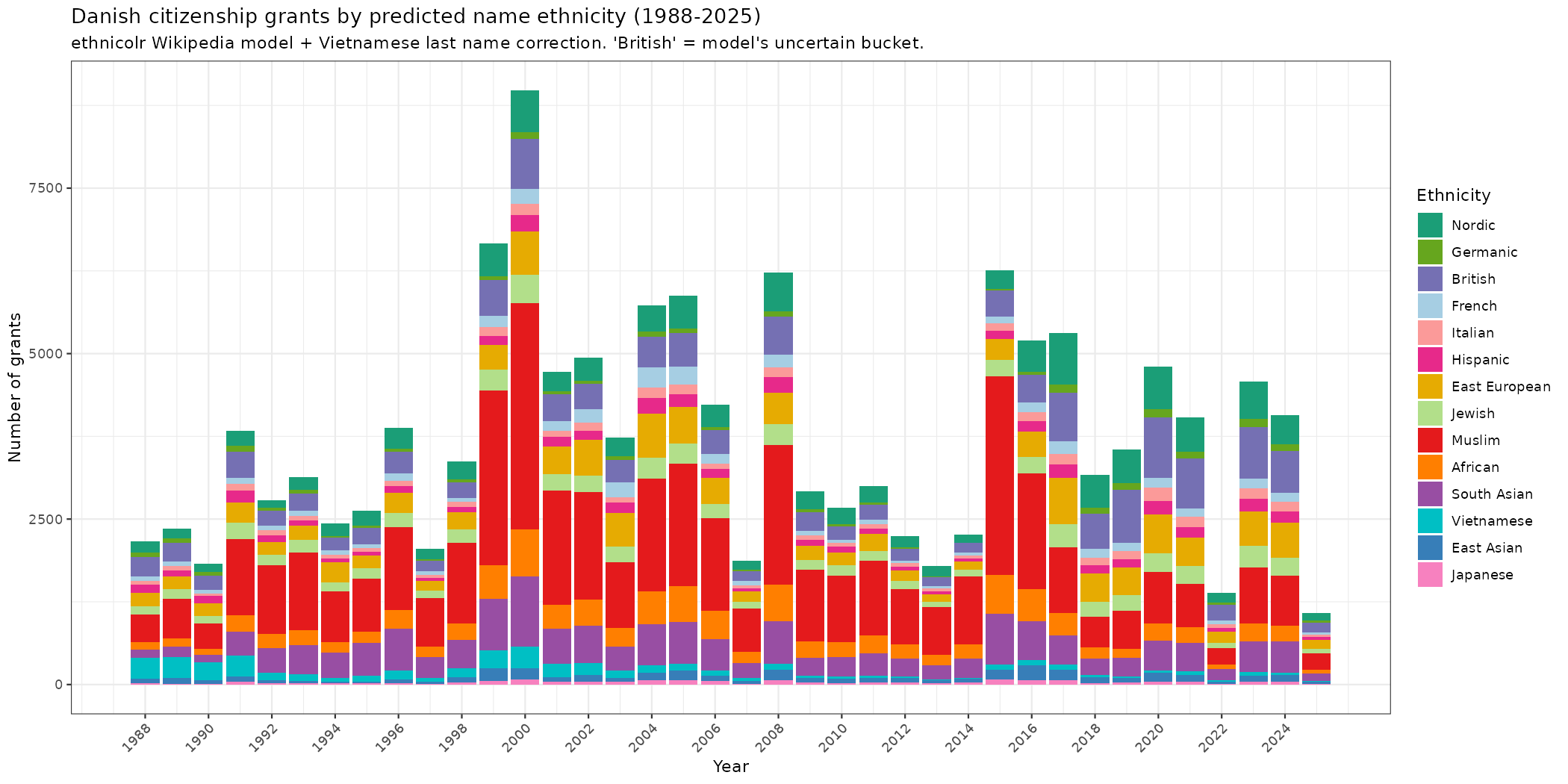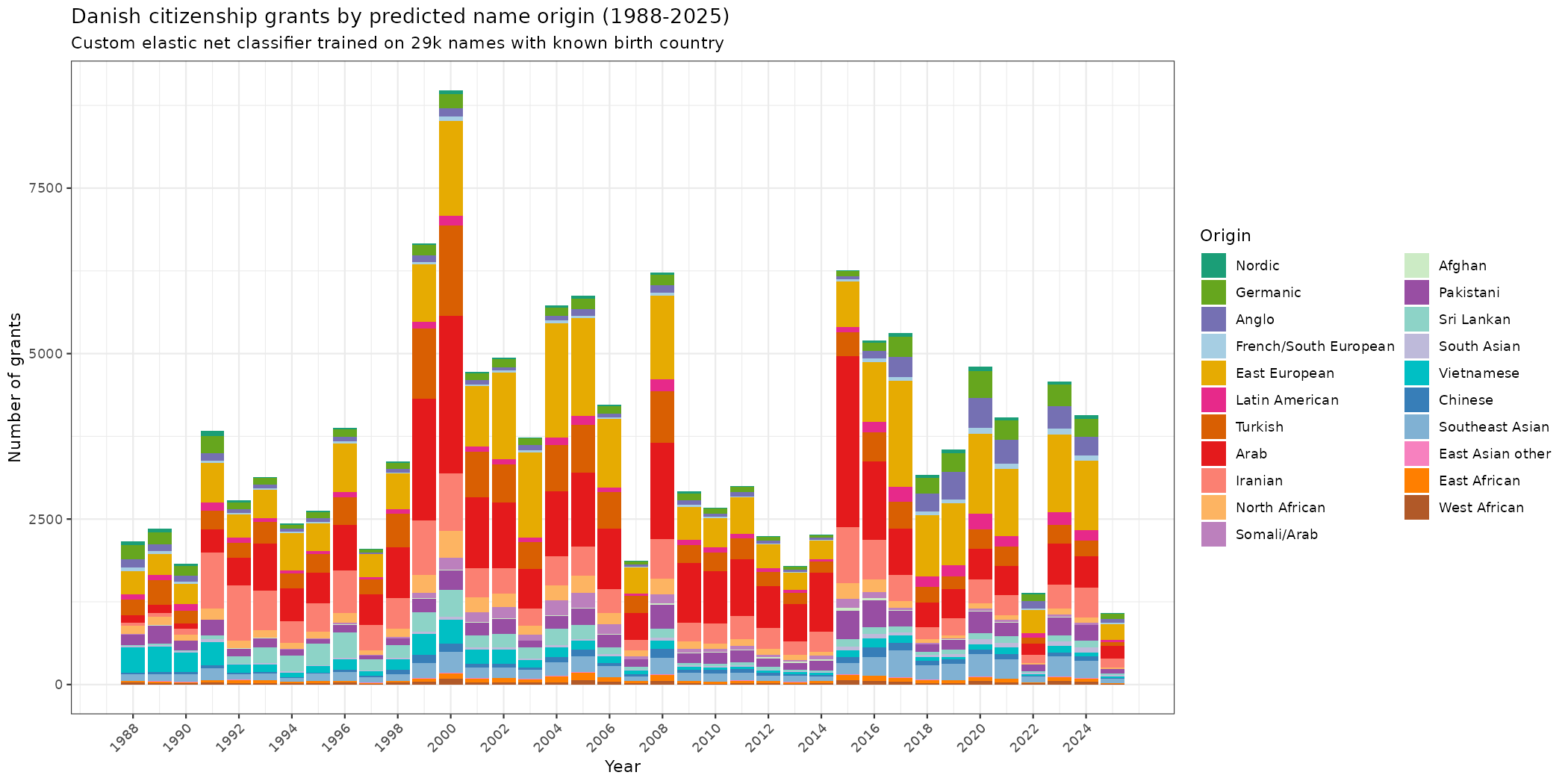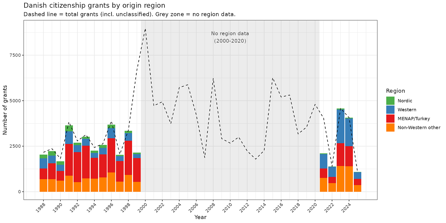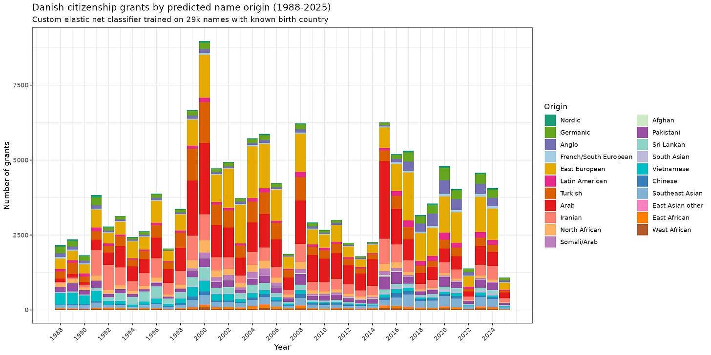 So there are two ways to be a Danish citizen. You are either granted it by virtue of birth to a Danish citizen, or parliament specifically makes a law to grant it to you. Since all laws are public, everybody who has been ‘naturalized’ this way has their name written in a law somewhere. This fact means that we can track all such conversions for the purpose of seeing who is ‘becoming Danish’ in this legal sense. Using Claude, I scraped all these laws and built a database. It turns out that the information available about the people also changes by year: