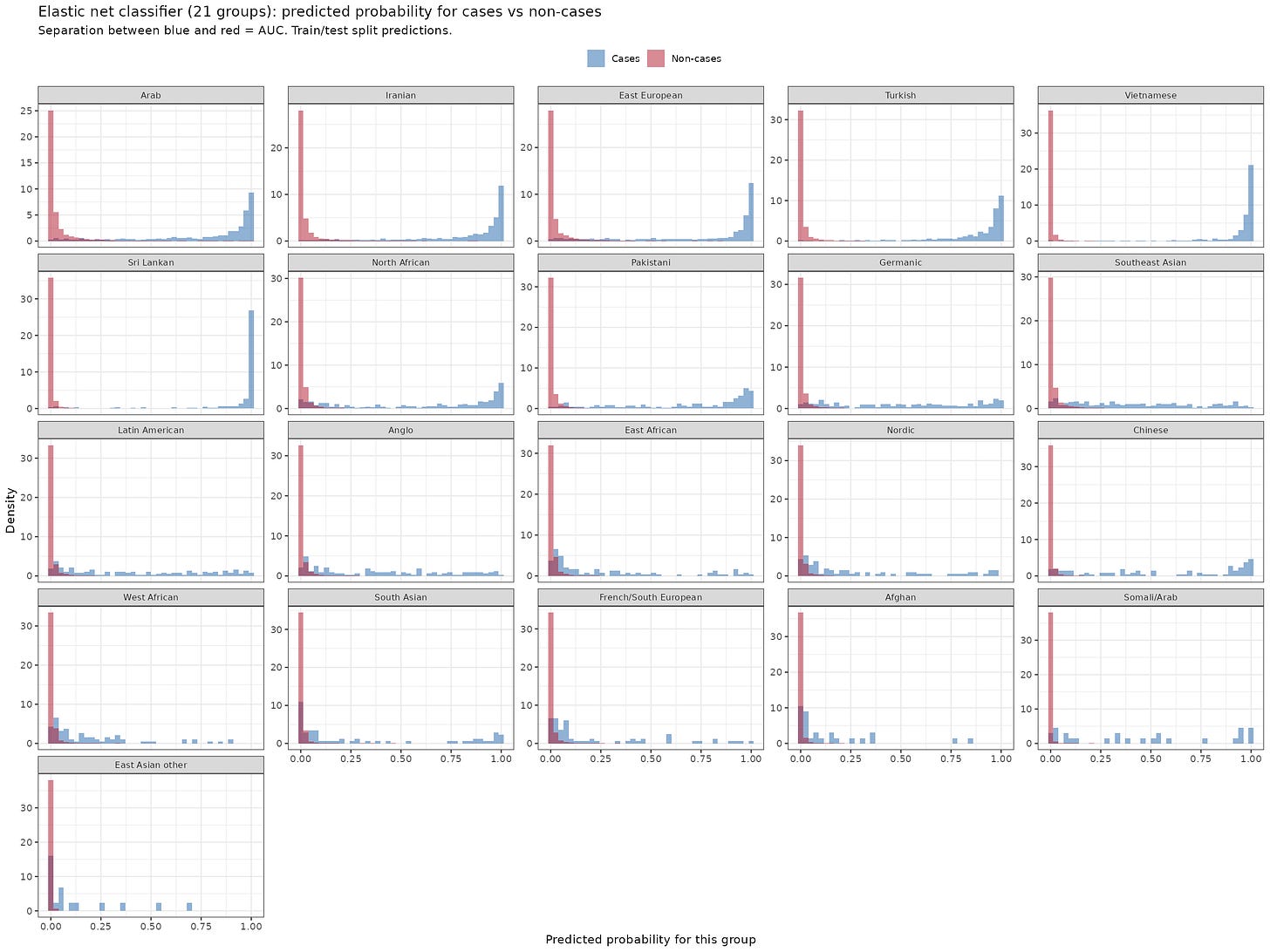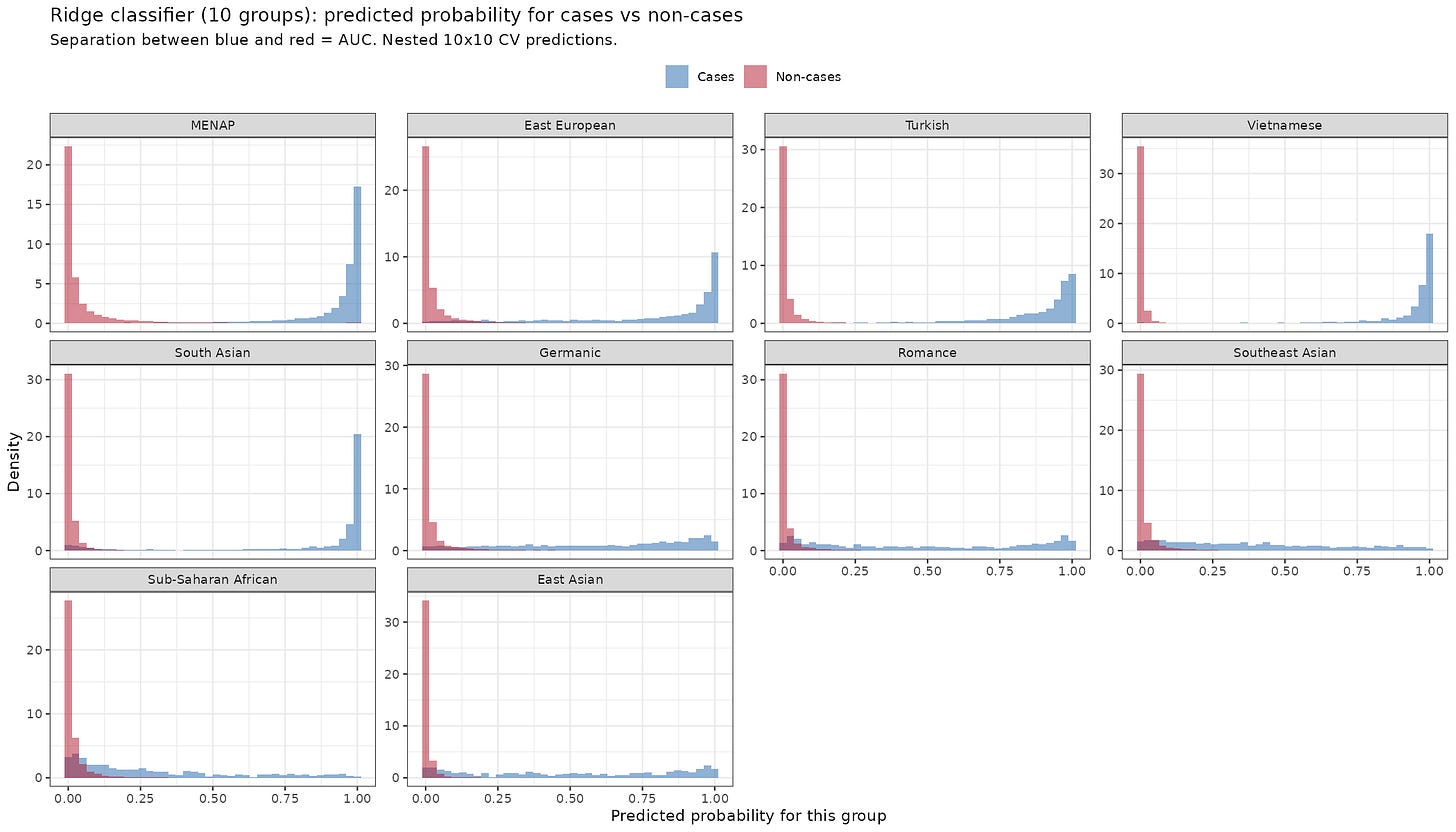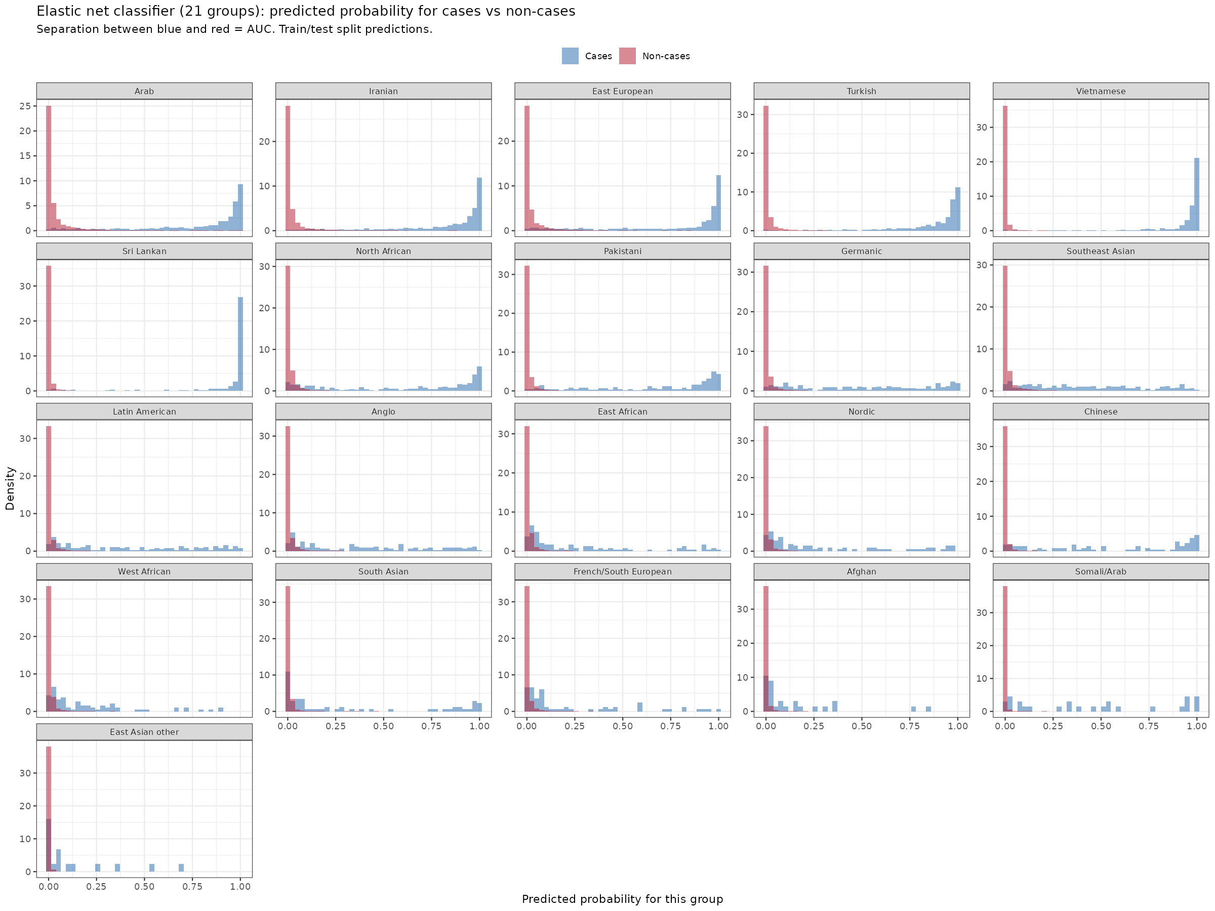 The larger groups have very distinctive probability distributions. Almost all the Vietnamese names are assigned with high probabilities and the non-Vietnamese names are not assigned high probabilities often. For smaller groups, it doesn’t work out so well. Latin American names are Spanish, so they get confused with the south European Spanish ones. Better is to look at the 10-group version: