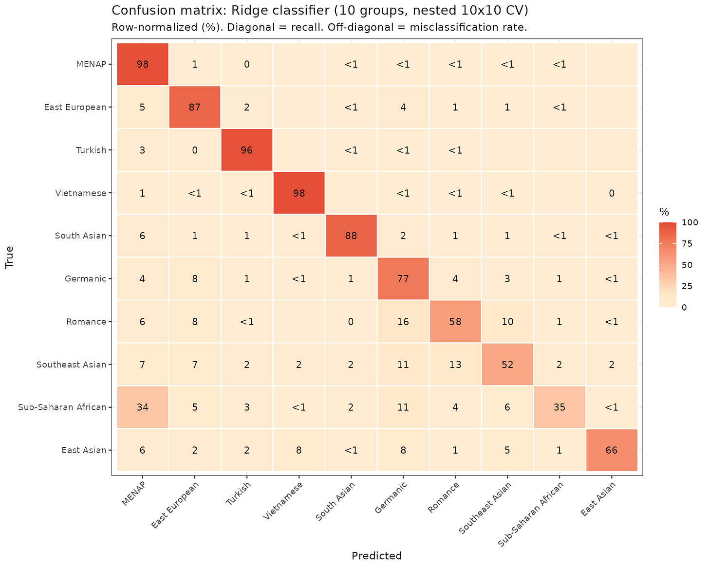 They are row-normalized (percentage), so you start with a row and read the values to see how each ‘true’ origin (birth country) is classified according to the model. For the main Muslim group MENAP, 98% are classified that way. For SS African, 34% are classified as MENAP due to Muslim names. The various European groups can’t get pulled apart cleanly, e.g. 16% of Romance origin names are classified into Germanic, presumably due to shared cultural origins, and the usual Frankish-Germanic mixture in France. Note that while some East Asian names are very distinctive, say, Japanese, there are only 34 Japan-born people in this dataset: