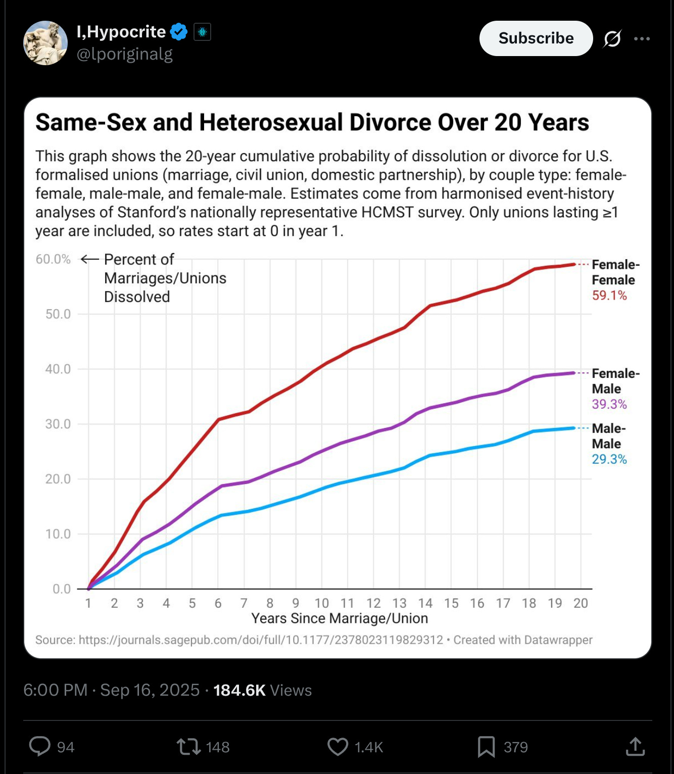 To simplify things, the best predictor of divorce is the amount of neuroticism in the relationship. With two women, you get more than average, and with two men, less than average. Consequently, lesbian couples are less stable and gay couples more stable than heterosexual ones.