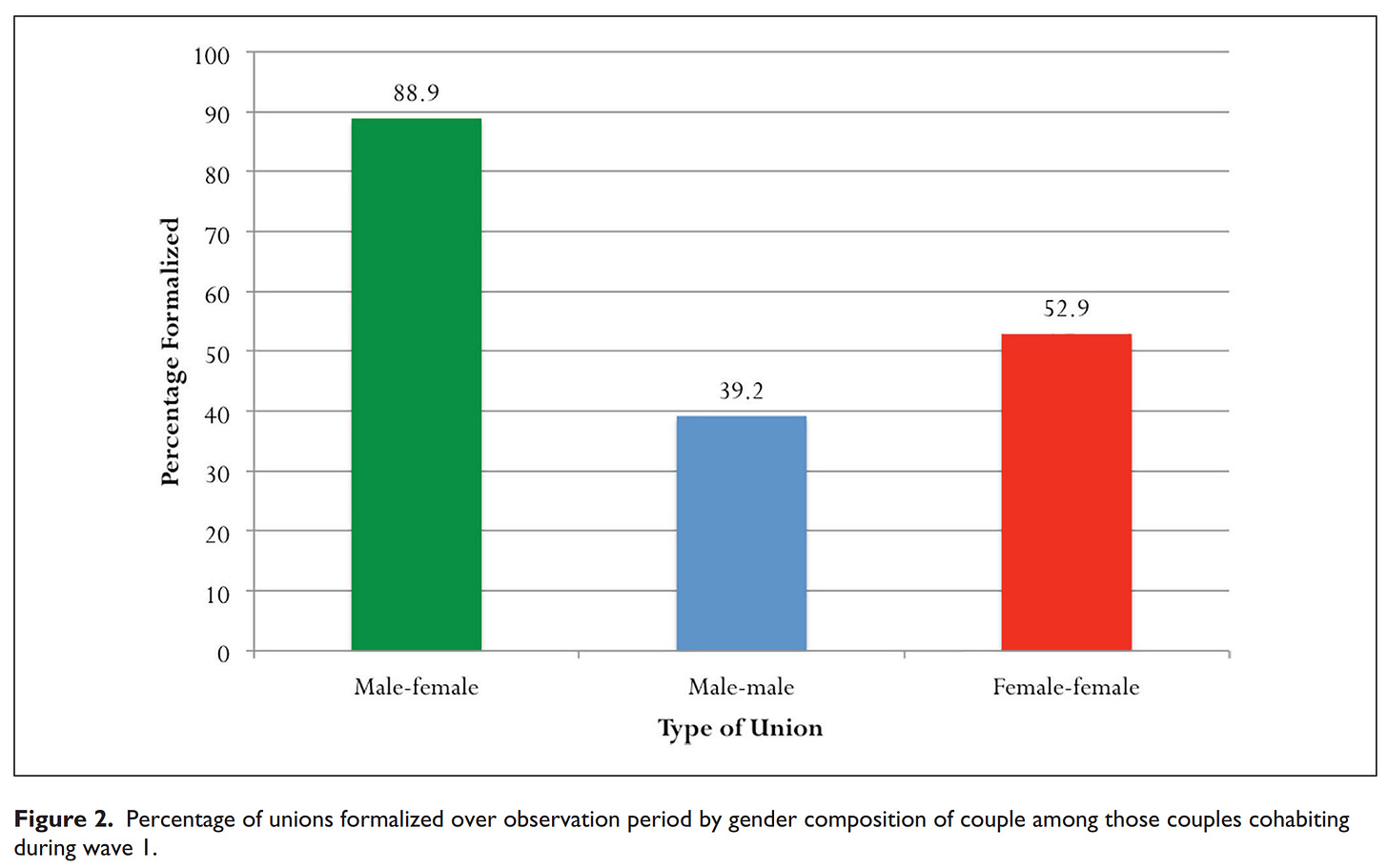 However, the differences observed by sex-combination cannot be explained solely in these terms because male-male relationships are the most stable, whether formalized or not. Lesbians have a slight advantage over heterosexuals among unformalized relationships, but taking a weighted mean would still show they are they are at a disadvantage in general.