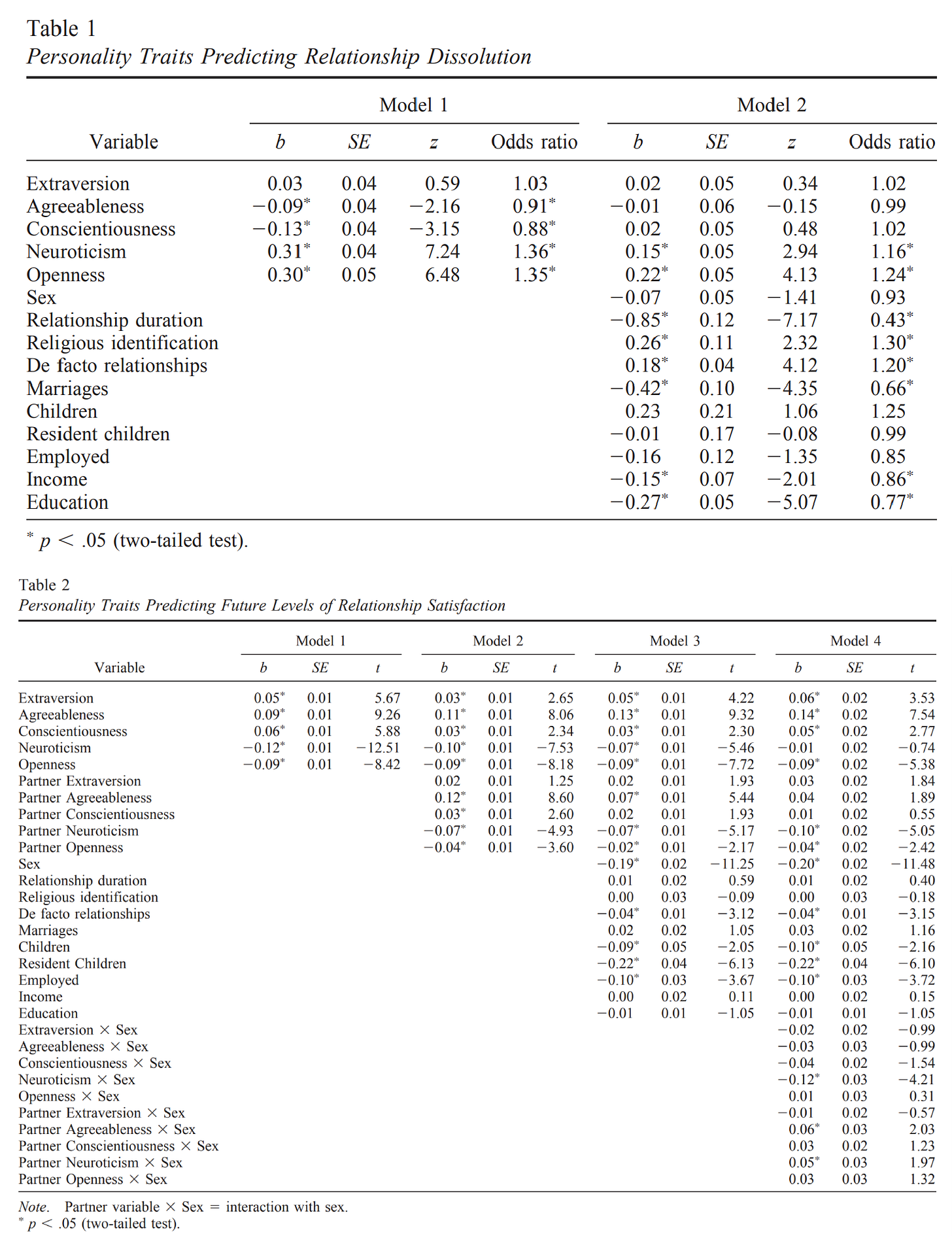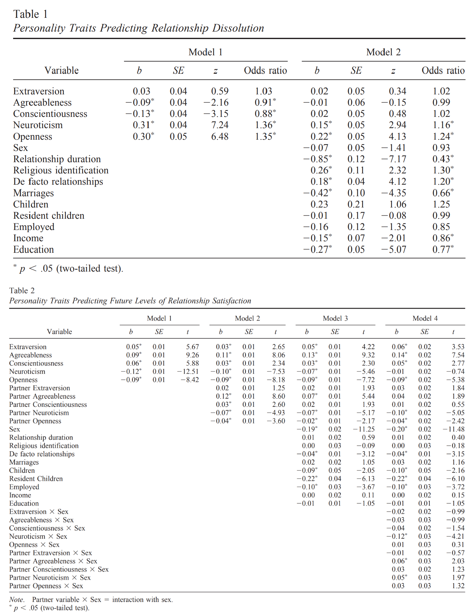 The first table shows I think average personality (their methods are not clear), which shows that neuroticism and openness predict dissolution with roughly equal effect sizes (0.30 logits). The specific p-values aren't given, but you can mentally just look at the z- or t-values, and conclude that anything above 4 is a reliable finding, around 2 (p=5%) is a maybe. The second table predicts relationship satisfaction, which is a more continuous and more statistically reliable quantity (but is self-reported). Here the same predictors work for both partners (neuroticism and openness [NO] bad, EAC good). Of interest are the interactions, which since female = sex, the values are the female effects on top of male reference. Of these interactions, only female neuroticism is a reliable finding (t = 4.2) for the index person, while strangely, for the partner female neuroticism predicts slightly positive relationship satisfaction (t = 1.97 which is meh tier). As such, we see that taken broadly, these results support the idea that we can add up neuroticism in a relationship to predict its dissolution or dissatisfaction leading to eventual dissolution.