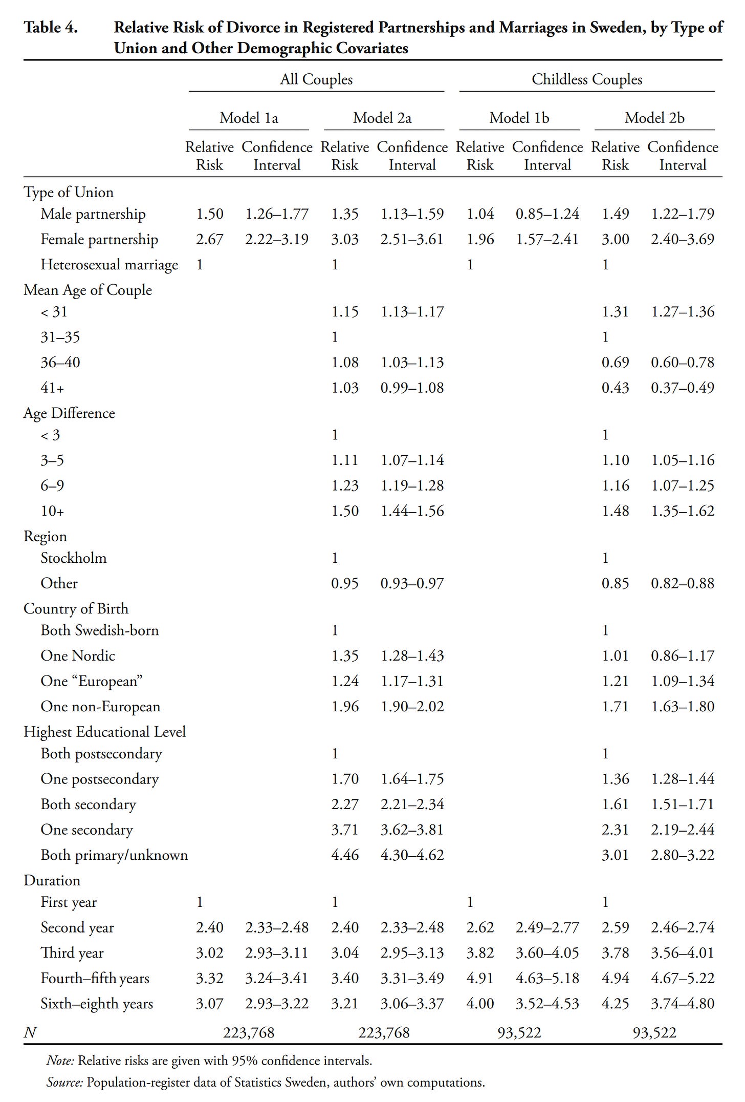 Their results only replicate the American results (which is from The How Couples Meet and Stay Together (HCMST) survey, note this sample was examined in multiple studies listed above) in part because the gays were more likely to dissolve their relationships than heterosexuals (relative rates of 1.35, 3.03 respectively, i.e., +35% and +203%). Note also that inter-ethnic relationships were less stable, something I have discussed before (even among fellow Nordics!). Note also that the table above is only for Sweden, because the Norwegian results for some reason didn't include heterosexuals as a comparison. It produced the same lesbian>gay pattern though.