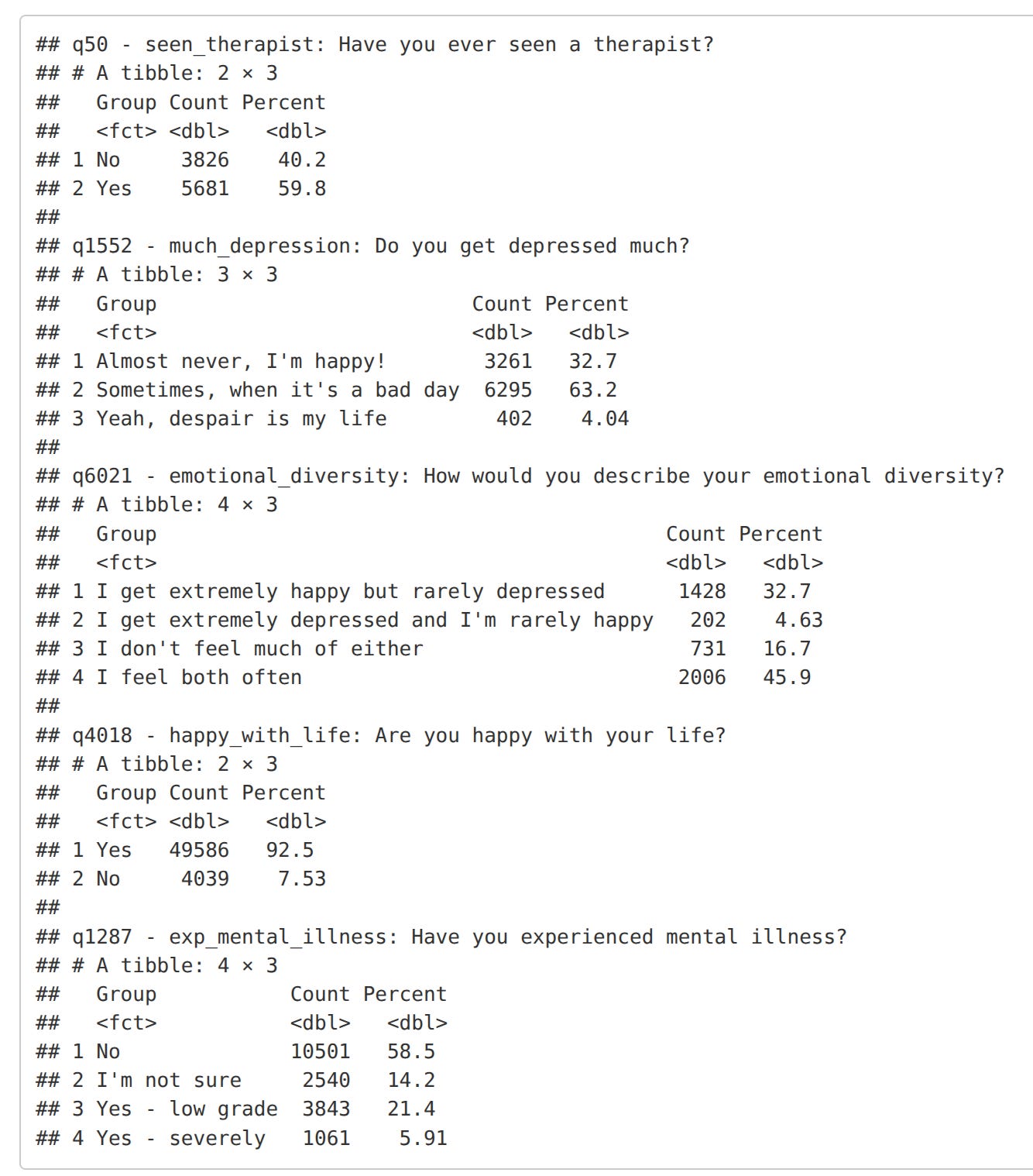 The order now lines up with the divorce rates we saw before. Since these aren't proper scores, it is probably not wise to calculate any ratios based on these pseudo total scores. As a replication, I looked in the OKCupid dataset, which has 5 questions related to mental health:
