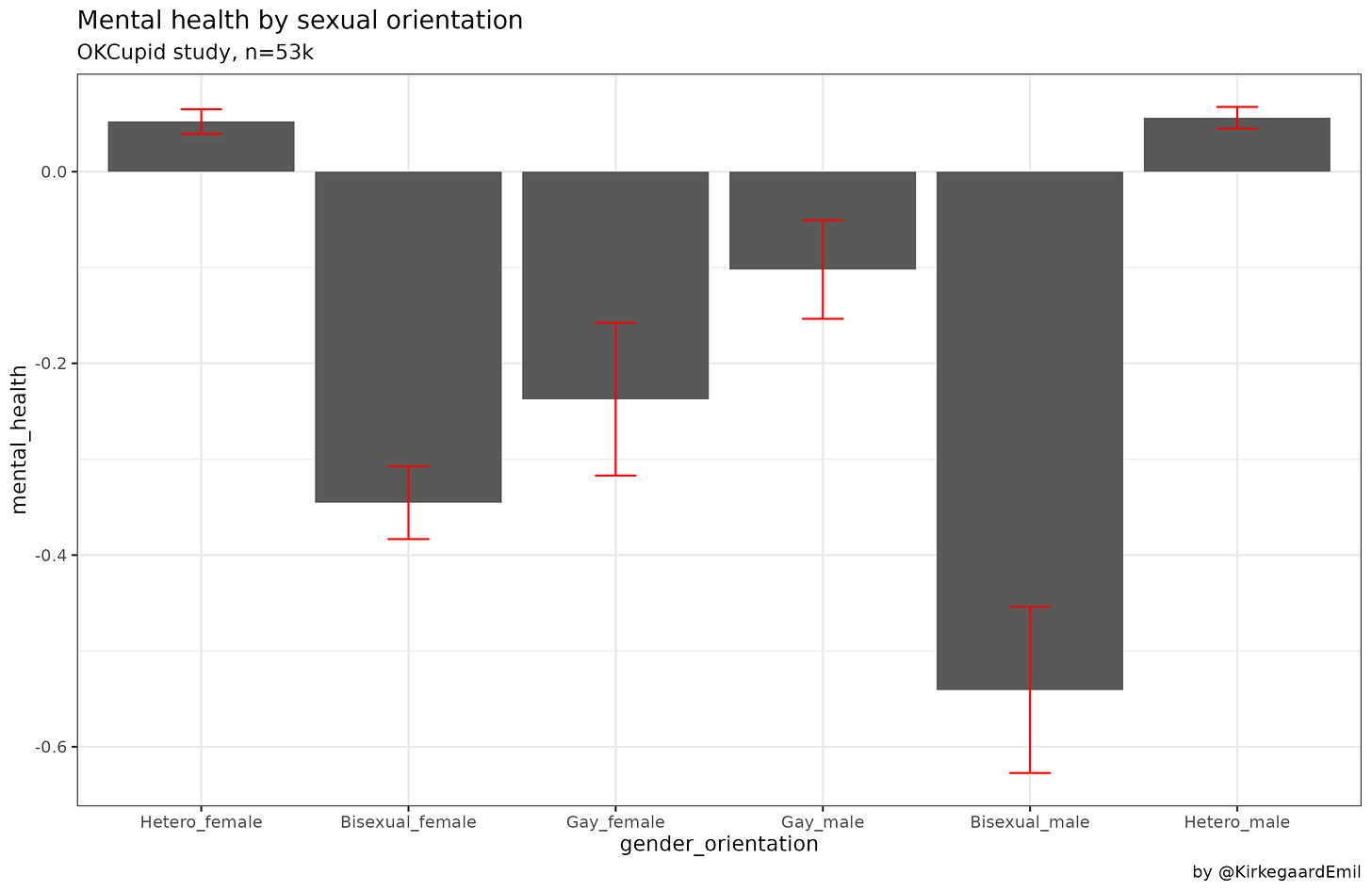 So what does explain the pattern? First off, we need to realize that the meme posting (of which I am also guilty) fell for the lack of confidence intervals issue, taking the apparent lower gay rate as real, whereas it was not and their rate is in fact somewhat higher than heterosexuals. If we look at their models, we see this: