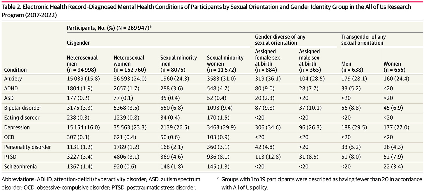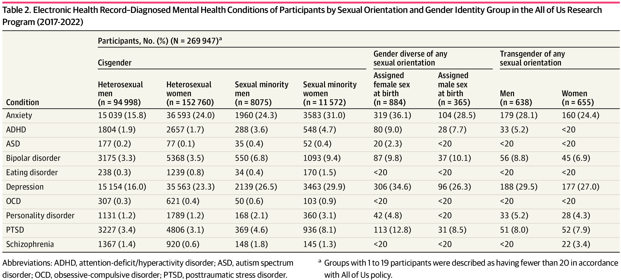Maybe the idea is correct, but we need to dig deeper into mental health measures as opposed to self-reported neuroticism. Here's the very large All of us study with diagnoses by sex and orientation: